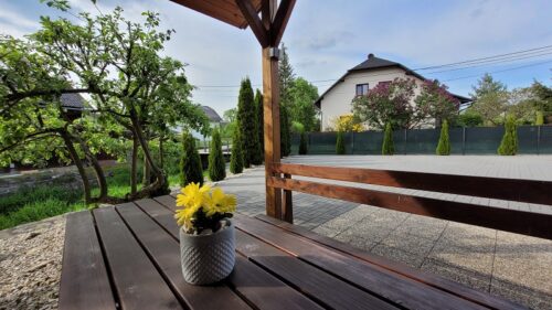 obytná místnost s 2lůžkovou postelí, rozkládací pohovka, koupelna s WC a sprchovým koutem, šatní skříň, věšáková stěna se zrcadlem, vybavená kuchyňka s lednicí, mikrovlnnou troubou, varnou deskou a nádobím, jídelní stůl se 4 židlemi, přístup na terasu, Wi-Fi.